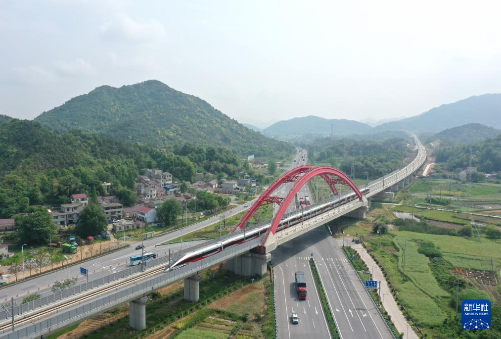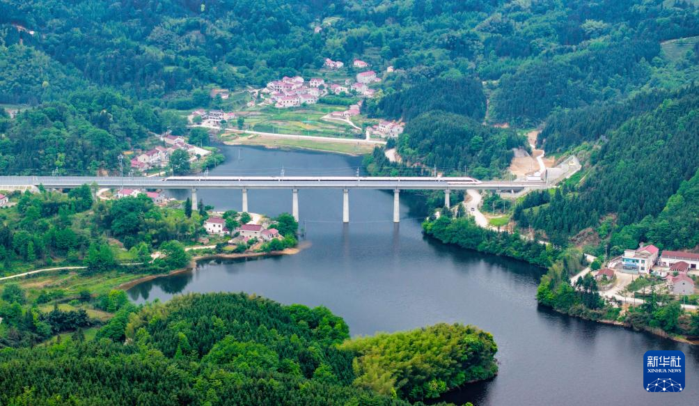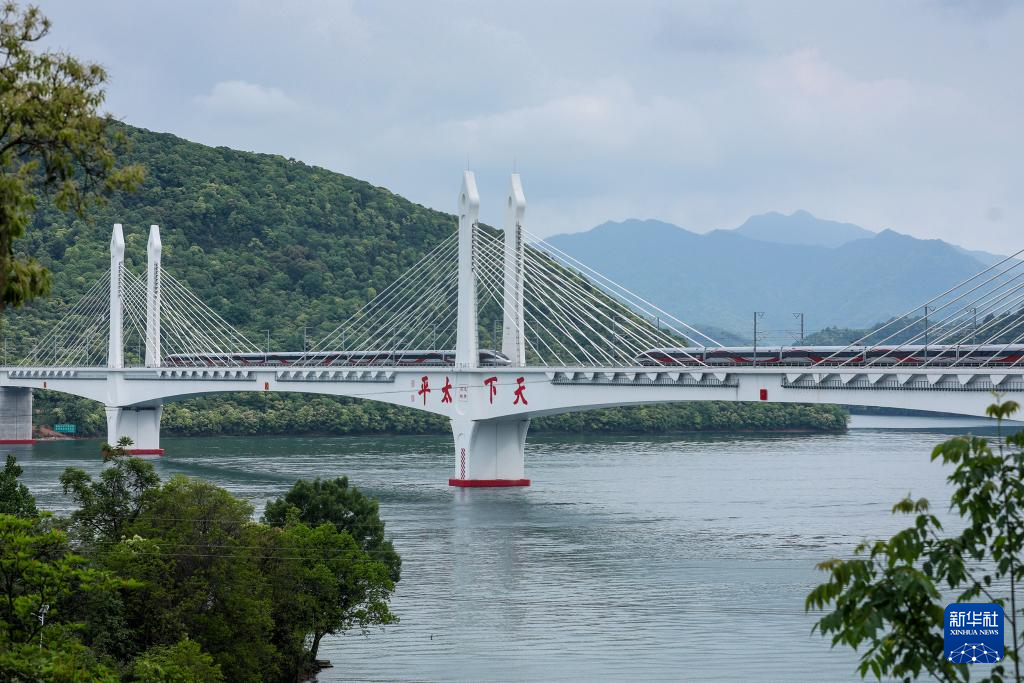 4月26日,列车驶过由中铁建大桥局承建的池黄高铁太平湖特大桥。新华社发(樊成柱摄)
