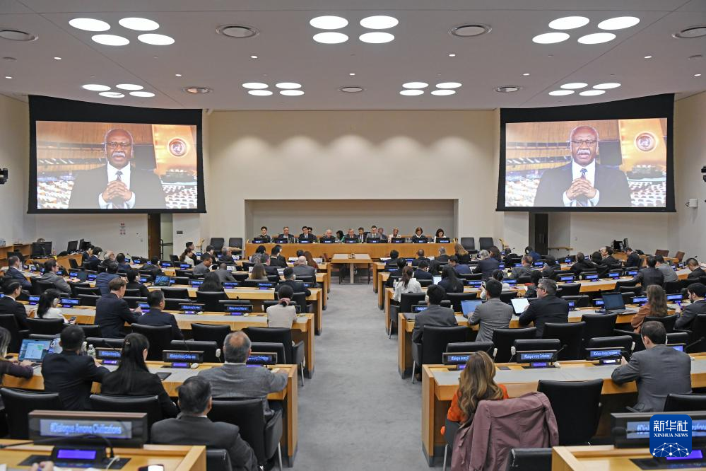 6月9日,在位于纽约的联合国总部举行的“庆祝文明对话国际日”主题对话会上,第79届联合国大会主席菲勒蒙·扬通过视频致辞。新华社记者 李睿 摄