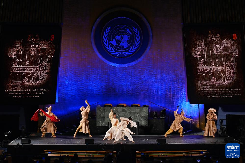 6月9日,在位于纽约的联合国总部,演员在“跨越山海的文明对话”专场文艺演出上表演舞剧《天工开物》选段。新华社记者 李睿 摄