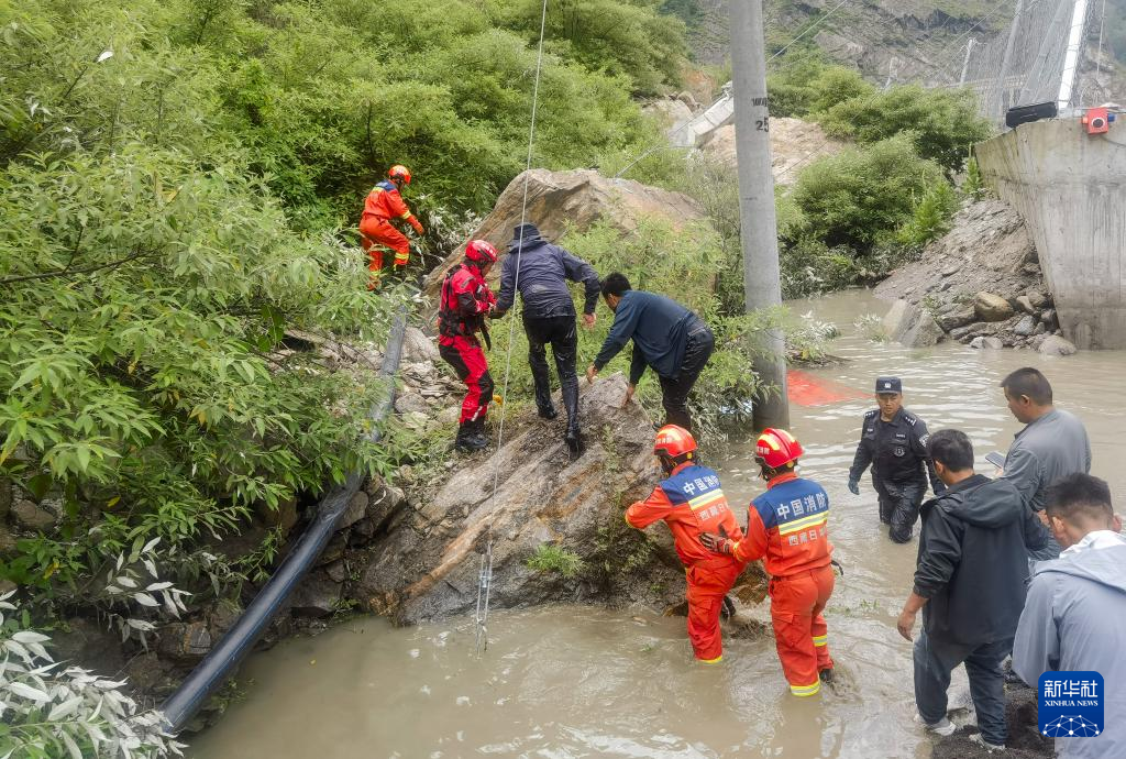7月8日,西藏消防救援总队救援人员在救灾现场疏散被困人员。新华社发(徐达富摄)