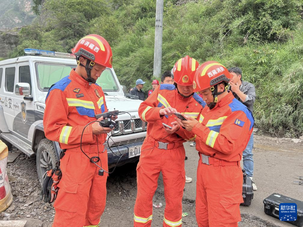 7月8日,西藏消防救援总队救援人员在救灾现场搭建4G单兵图传系统。新华社发(徐达富摄)