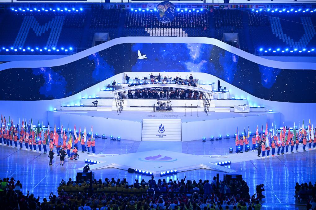 7月16日,中国代表团在开幕式上入场。新华社记者 胡星宇 摄