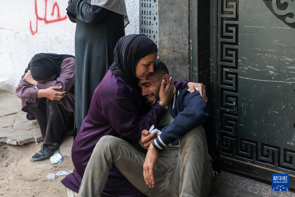10月29日,巴勒斯坦人在加沙城的希法医院痛哭,哀悼在以色列空袭中死难的亲友。新华社发(里泽克·阿卜杜勒贾瓦德摄)