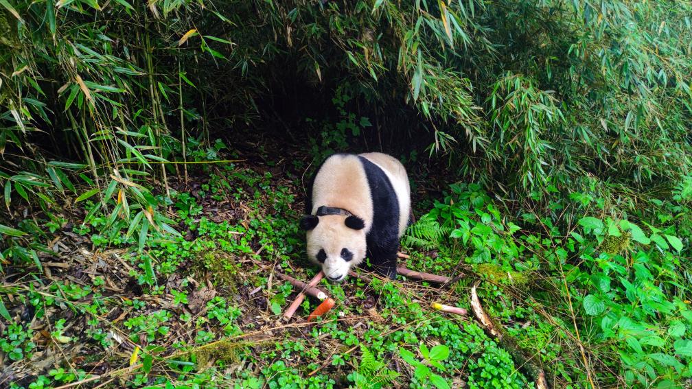在位于大熊猫国家公园卧龙片区内天台山的大熊猫第二阶段野化培训场内,雌性熊猫“辉辉”准备吃投喂的竹笋和胡萝卜(2024年6月9日摄)。新华社发(牟仕杰 摄)