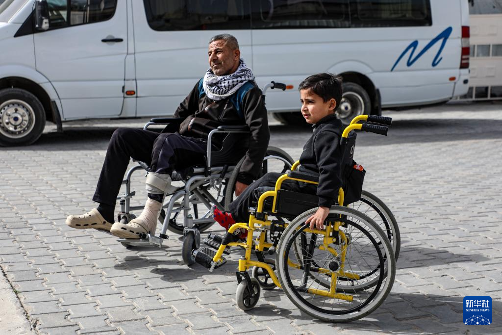 2月2日,在加沙地带南部汗尤尼斯,巴勒斯坦人等待通过拉法口岸到加沙地带以外地区就医。新华社发(里泽克·阿卜杜勒贾瓦德摄)