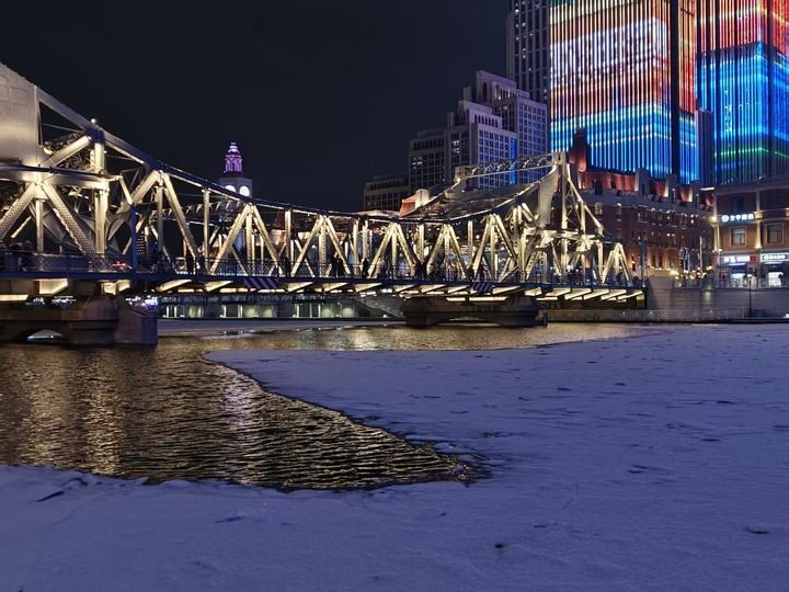1月17日,四九天应季降雪,我专程在夜幕时分来到解放桥,青色的钢桥早已覆上白霜,津湾广场和世纪钟的身影在雪色中亮如白昼。海河上有大块浮冰,已经落满了薄雪。两岸人流如织,寒风中到处都是热气腾腾的面孔,有本地人,也有专门从各地来看雪的游客,唱歌、赏雪、散步。这个瞬间,我感受到这条河的“暖”,似乎没有漫长的寒冬,聚集着热气,冰面下永远是流动的热情。