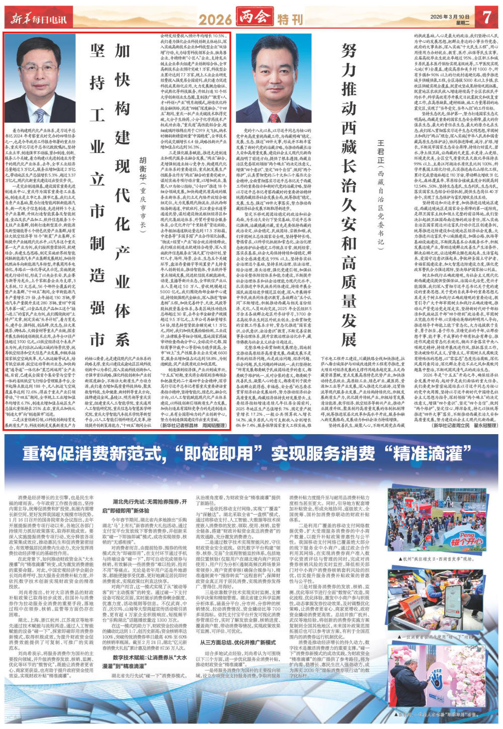 三是强化服务赋能,推进先进制造业和现代服务业融合发展。“两业”融合,是增强制造业核心竞争力、构建现代化产业体系的重要途径。重庆把发展生产性服务业作为“两业”融合的重要突破口,谋划实施专项行动方案,以增加就业、集聚人口为核心指标,“小切口”推进18个细分领域发展,加快构建优质高效的服务业新体系。我们立足内陆开放综合枢纽定位,大力发展现代物流业,依托西部陆海新通道、中欧班列、长江黄金水道等通道优势,谋划建设物流枢纽经济区和现代化集疏运体系、外贸外资综合服务体系,公交化开行“千里轻舟”货运班轮,去年枢纽通道联运量达到17.3万标箱,中老泰等“多国多园”产业合作深化拓展,“物流+经贸+产业”综合效应持续释放。我们顺应制造业软硬结合趋势,深入实施软件信息服务业“满天星”行动计划,紧盯人才、场所、场景、企业、生态五个关键环节,盘活存量楼宇等闲置资产支持青年人创新创业,推动智能体、专业软件等重点领域发展,促进软信技术赋能游戏、动漫、直播等新兴业态,全市软信产业从业人员超过50万人、营收规模超过5000亿元。我们围绕西部金融中心建设,持续做强现代金融业,深入推进“智融惠畅”工程,加快完善种子、天使、风投等股权投资基金体系,各类区域性功能性总部超过30家,去年全市金融资产规模超过9.5万亿元,上市公司再融资增长5.4倍,绿色转型贷款余额突破1.1万亿元。同时,我们加快发展检验检测、工业设计、法律服务等细分领域,落地国家药械审评检查西南分中心,全球设计之都、国际商事仲裁中心等影响力稳步提高,全市“四上”生产性服务业企业突破6600家,服务业增加值占比达到58.8%,为制造赋能、促产业提质效应加快显现。