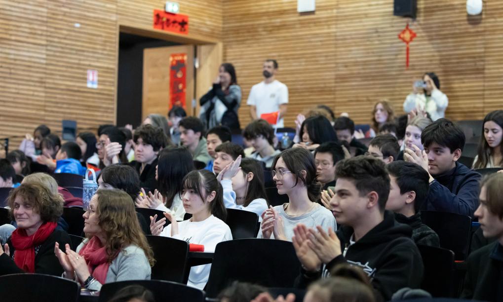 2月5日,在法国马诺斯克,普罗旺斯-阿尔卑斯-蓝色海岸大区国际学校学生在春节活动上表演。新华社发(普罗旺斯-阿尔卑斯-蓝色海岸大区国际学校供图)