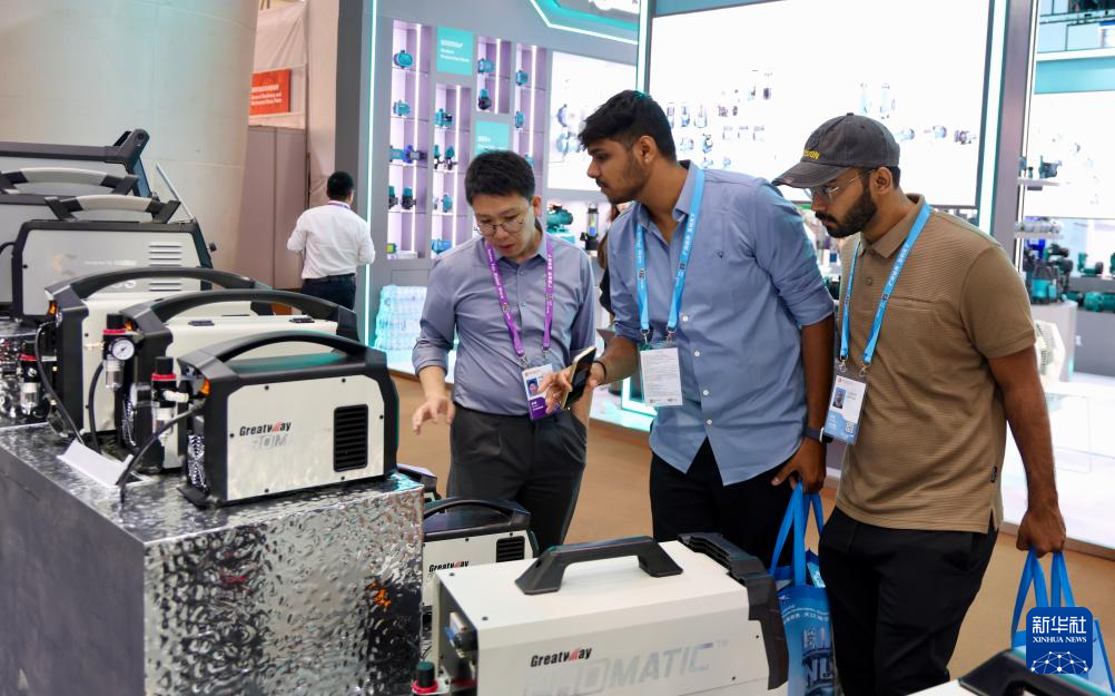 4月15日,外商在广交会上了解选购机电产品。新华社记者 卢汉欣 摄