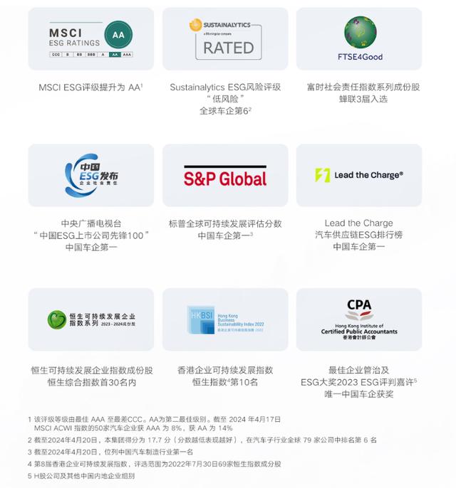 凭借丰富的ESG实践成果和完善的战略布局,吉利汽车获得多项ESG权威评选荣誉,包括MSCI ESG评级提升到AA级;首次获选为“恒生可持续发展企业指数”成份股;标普ESG评分位列中国汽车制造行业第一名等,强效印证了吉利汽车可持续发展价值深受国际权威机构认可,稳居中国汽车公司中的ESG领导者地位。