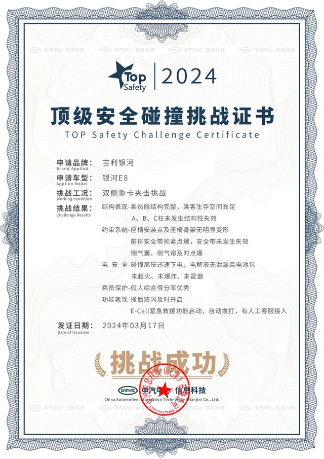 伴随技术成果不断涌现,吉利汽车新能源产品的安全品质也实现了跨越式提升,通过银河L6三车高速连环追尾碰撞、银河E8的20吨失控重卡夹击魔鬼碰、领克08侧碰叠加柱碰等高于国标的实战测试,印证了强大安全实力。其中,吉利汽车有6款在售车型获得C-NCAP五星安全认证,吉利银河L7获评“2023年度中国汽车低碳领跑者车型”,吉利银河E8荣获中国首个六维电安全体系认证001号证书,领克09获首批中国健康汽车认证等,获得了众多行业机构的权威认证和市场用户的广泛认可。