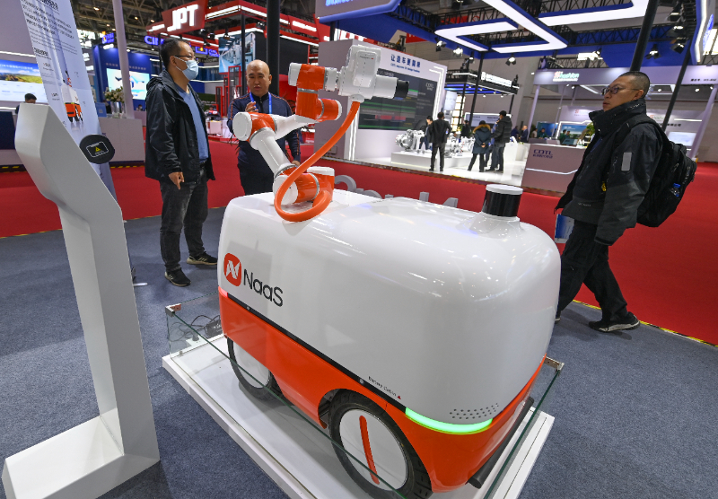 (资料图片)这是在2023年的链博会智能汽车链展区,参展商向参观者介绍一台自动充电机器人。新华社记者 蔡湘鑫 摄