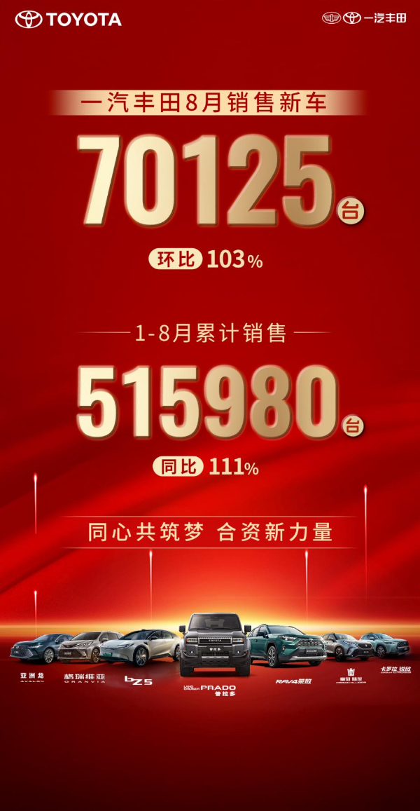 近日,一汽丰田公布8月销售业绩;8月销售新车70125辆,1-8月累计销售515980辆,同比增长11%。