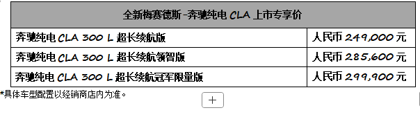 11月5日,全新梅赛德斯-奔驰纯电CLA正式上市,提供奔驰纯电CLA300L超长续航版、奔驰纯电CLA300L超长续航领智版、奔驰纯电CLA300L超长续航冠军限量版(100台限量发售)等3款车型选择,全国统一的上市专享价分别为人民币249,000元、285,600元和299,900元。全新奔驰纯电CLA是最高效、最智能的奔驰量产车型,凭借同级唯一的电动两挡变速箱,带来10.9千瓦时/100公里的电耗,成就同级能效标杆。其搭载AI赋能的智能座舱,应用字节跳动豆包大模型,并搭载以奔驰标准打造、并与Momenta合作研发的城区及高速领航辅助驾驶系统,为中国客户量身定制智能出行体验。全新奔驰纯电CLA更在豪华氛围与安全科技领域贯彻奔驰标准,142颗发光星徽呼吸式点亮,把仪式感拉满,标配同级领先的11个安全气囊,将安全感给足。全新奔驰纯电CLA在全国范围内的奔驰纯电专注经销商进行销售,并在上市之日起提供限时有效的全国统一上市专享价。