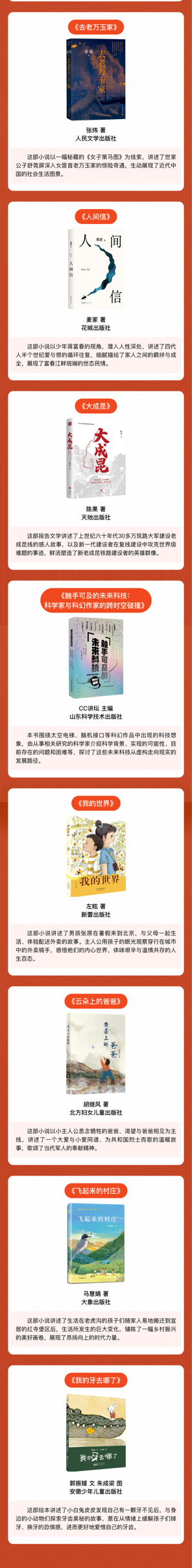 《中国式现代化的文化基因》《家国记忆:一对五十年代大学生的时代背影》《(新编)中国通史纲要》《宽容与执拗:迂夫司马光和北宋政治》《古代诗歌中的北京》《韩家往事》《在旷野里》《去老万玉家》《人间信》《大成昆》《触手可及的未来科技:科学家与科幻作家的跨时空碰撞》《我的世界》《云朵上的爸爸》《飞起来的村庄》《我的牙去哪了》入选。
