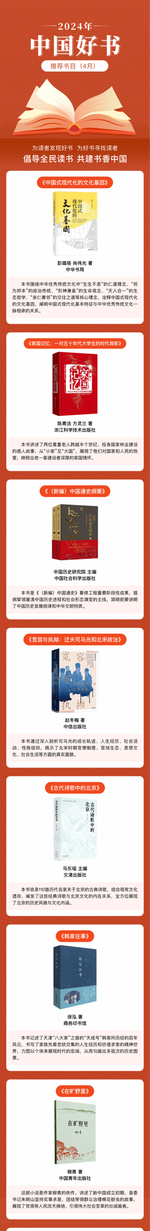 在中宣部出版局指导下,经中国图书评论学会组织评选,2024年4月“中国好书”推荐书目5月20日发布。