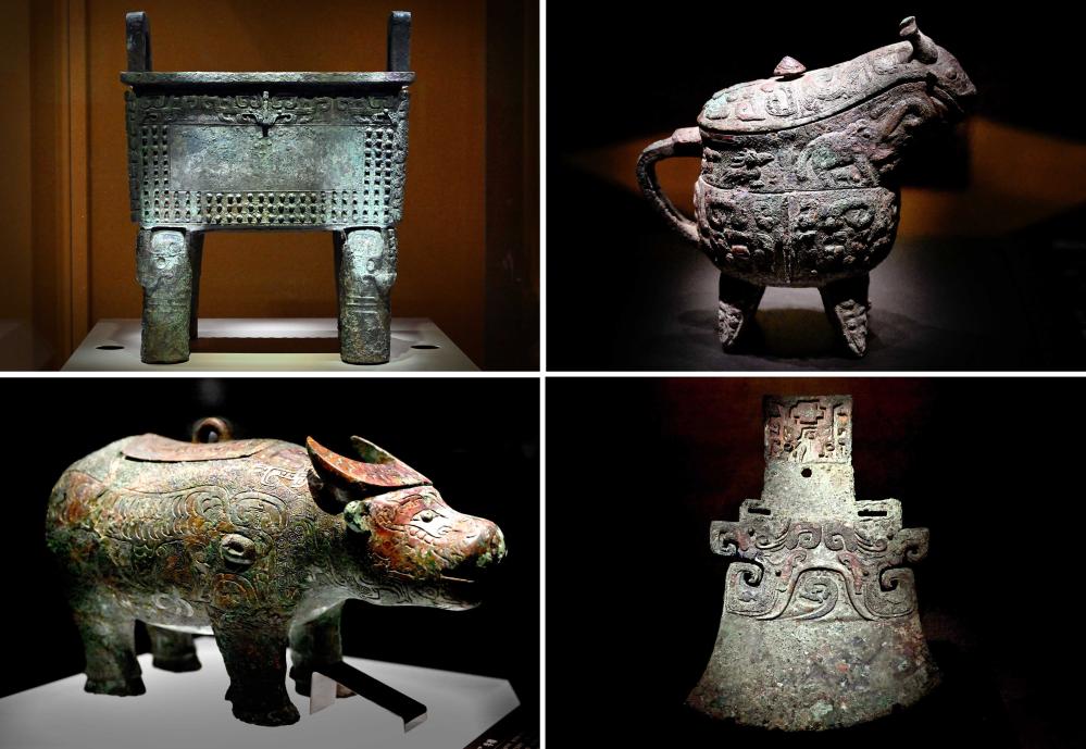 这是2024年2月23日拍摄的河南安阳殷墟博物馆新馆内展出的“司母辛”铜鼎(左上)、“亚长”铜觥(右上)、“亚长”牛尊(左下)、“亚长”铜钺(拼版照片)。新华社记者 李安摄