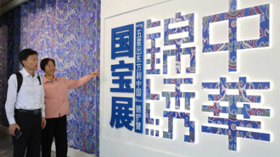 游客在参观中华锦绣——“五星出东方利中国”锦护臂国宝展。张琪 摄