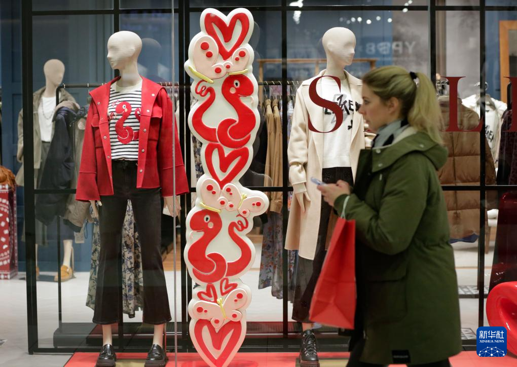 1月13日,一名女子在加拿大温哥华的一家商场内走过装饰有蛇年春节主题的橱窗。