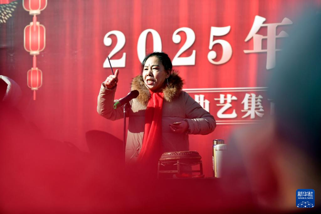 2月9日,河北省沧州市的曲艺艺人朱玉凤在胡集书会上表演西河大鼓《罗成算卦》。