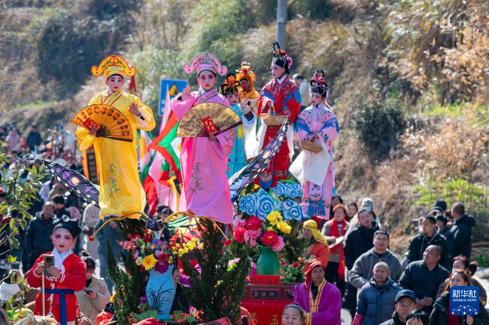 2月11日,在湖南省汨罗市长乐镇,人们参加抬阁故事会。“长乐抬阁故事会”是长乐镇当地一项传承千年的元宵节民俗活动,2011年入选国家级非物质文化遗产扩展项目名录。