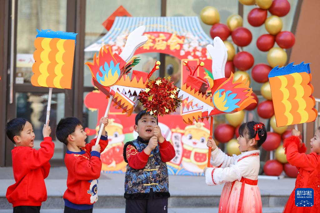 2月10日,小朋友在山东省青岛市李沧区九水东路幼儿园开展的民俗活动中进行舞龙表演。