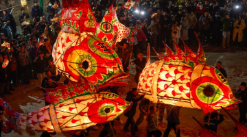 2月12日,在摩洛哥拉巴特,一名女子与蛇形手提灯笼留影。