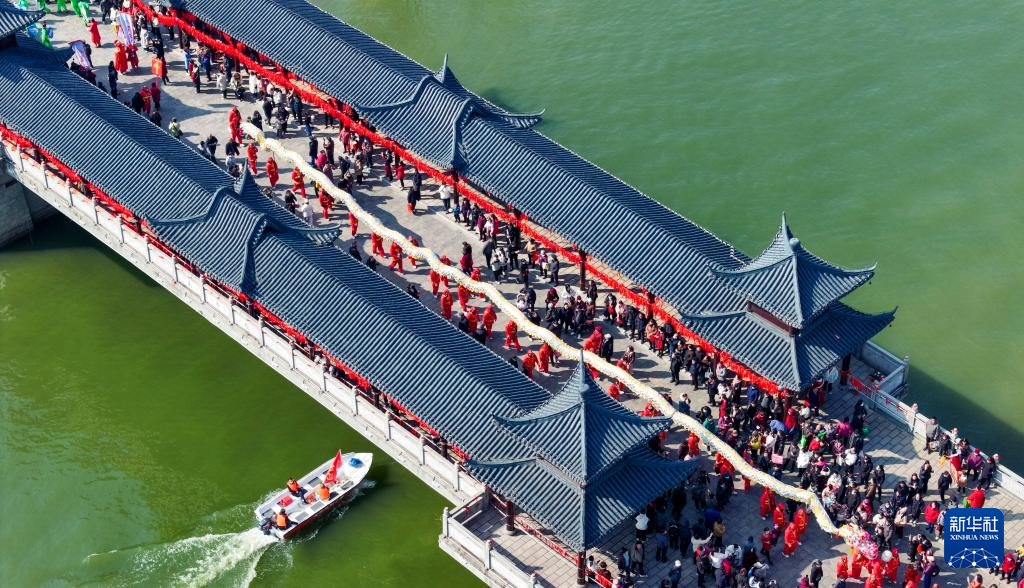 2月13日,民俗文艺表演队从全椒县太平桥上经过(无人机照片)。