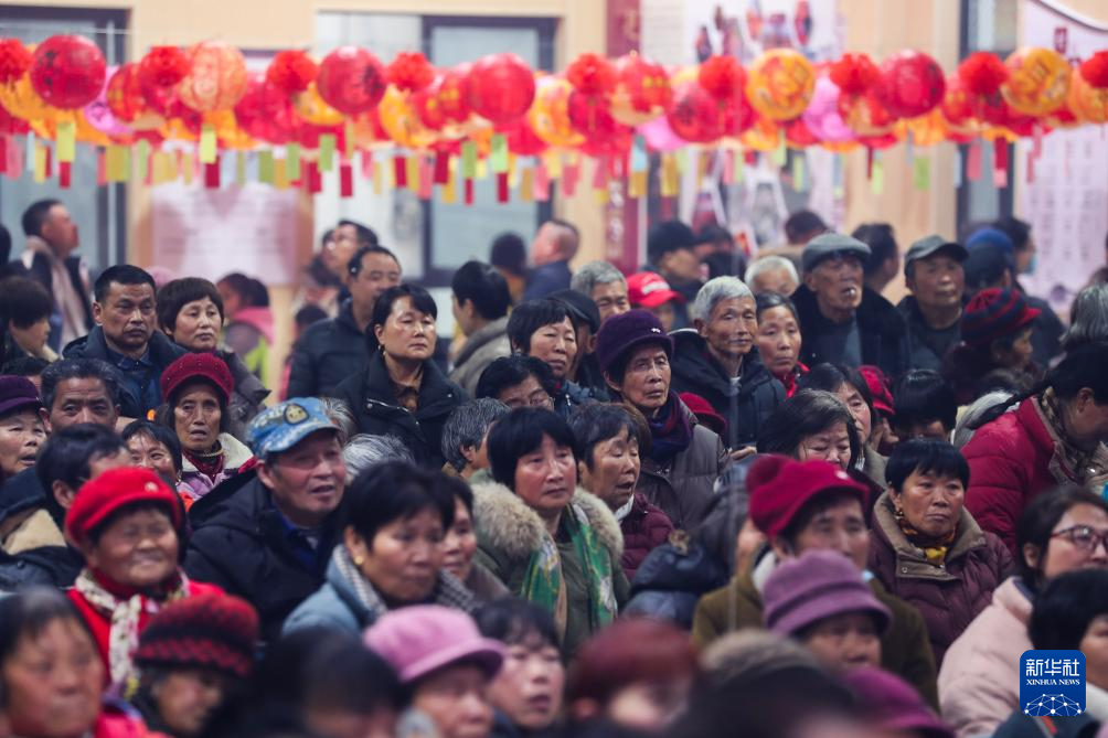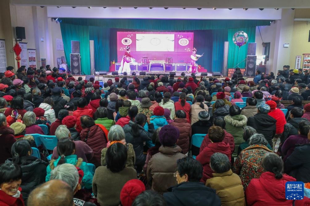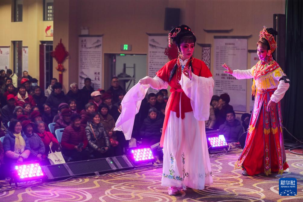 2月15日,村民在大墅镇儒洪村文化礼堂观看传统戏曲表演。