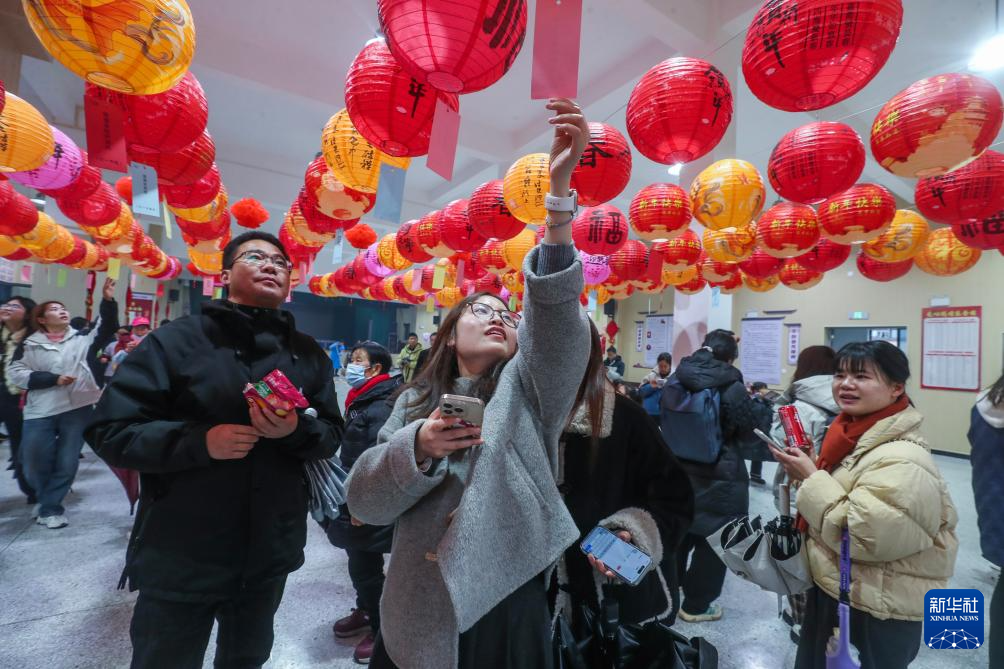 2月15日,村民和游客在大墅镇儒洪村猜灯谜。
