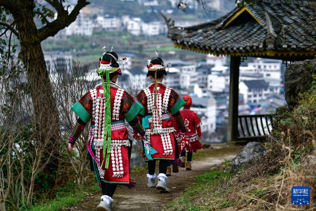 在贵州省凯里市舟溪镇舟溪村茶林苗寨,两对苗族双胞胎姐妹前往“甘囊香”芦笙堂参加芦笙节活动(2月15日摄)。
