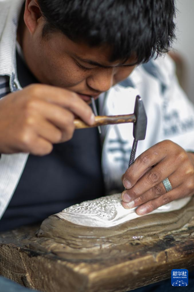 3月6日,扎西吉彩的手工匠人在给银器塑形。