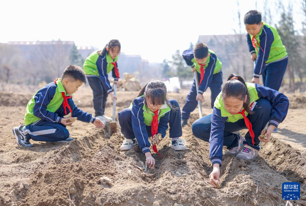 3月20日,在山东省荣成市府新小学劳动实践基地,学生们在菜园里种土豆。