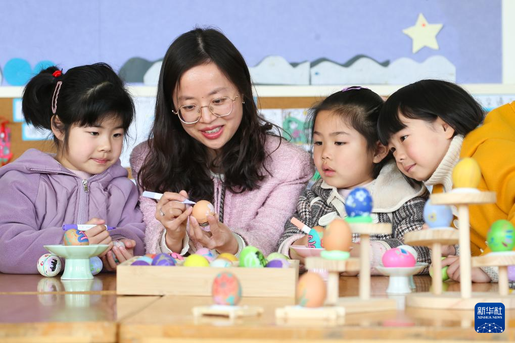 3月20日,在江苏省句容市郭庄镇葛村中心幼儿园,老师指导小朋友绘制彩蛋。