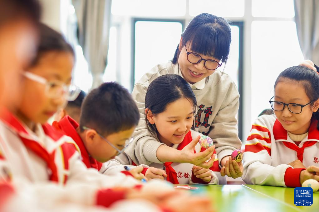 3月20日,在山东省临沂市沂南县湖头镇中心幼儿园,小朋友在体验立蛋。