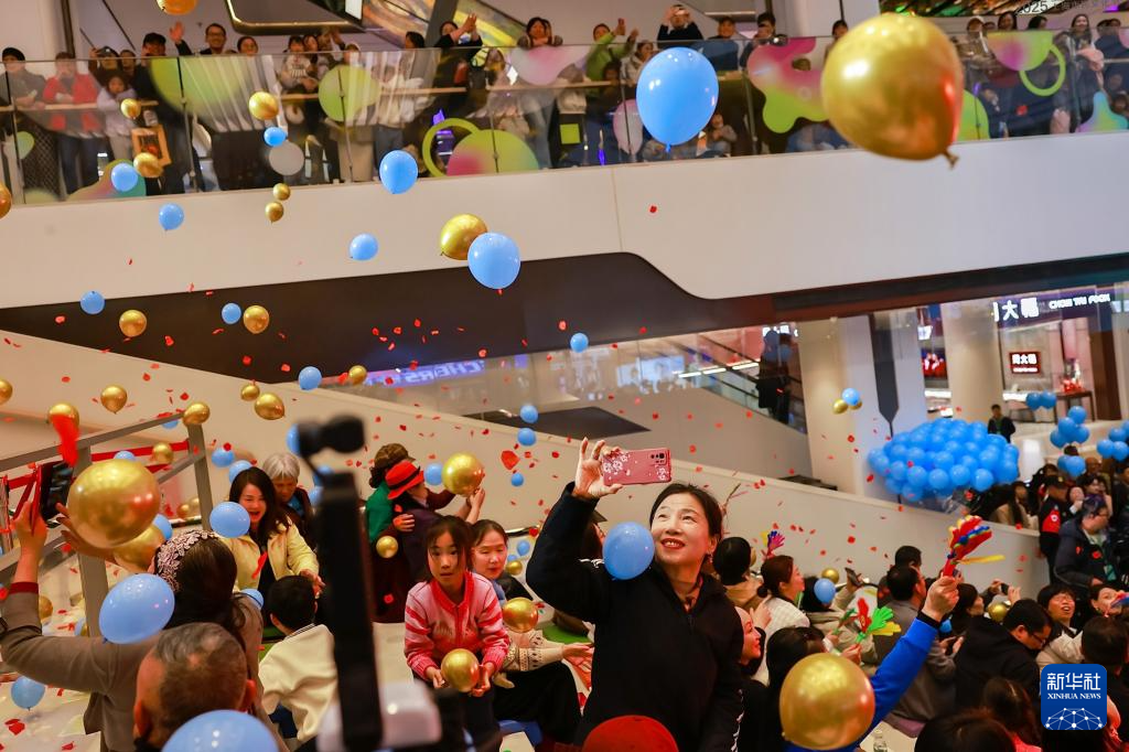 3月29日,市民们在嘉亭荟举行的群众文艺“百团汇演”现场参与互动。
