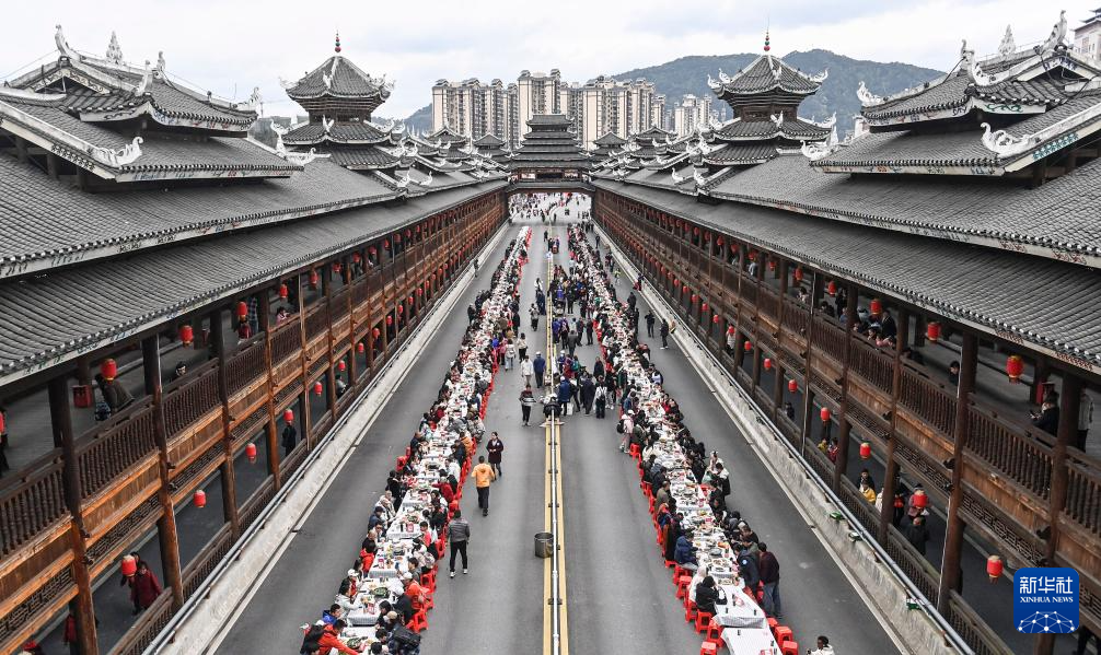 3月31日,在广西三江侗族自治县古宜镇,人们参加百家宴。
