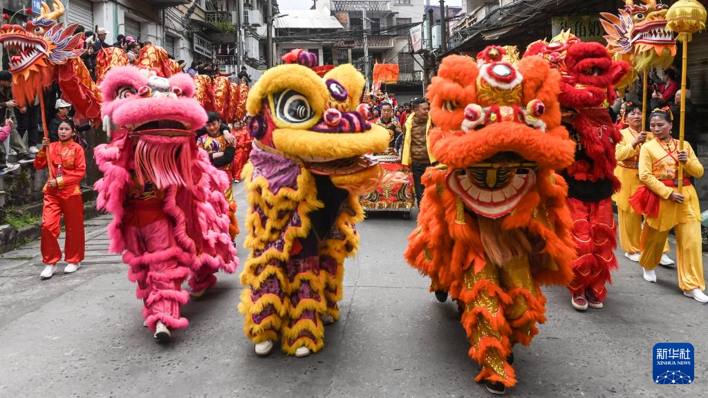 3月31日,龙狮队在广西三江侗族自治县古宜镇沿街巡演。