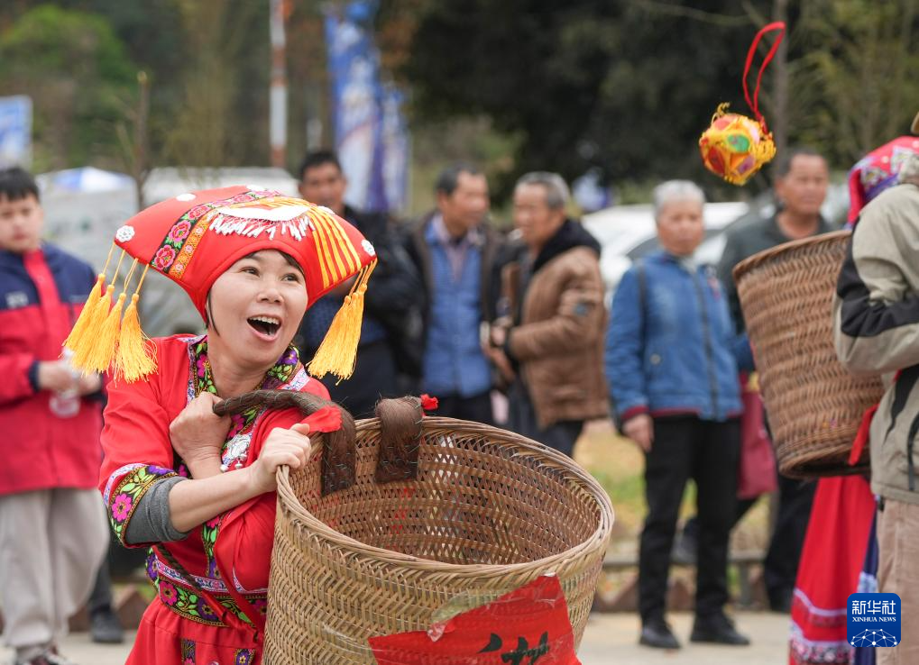 3月31日,在广西融水苗族自治县三防镇乃文村,村民参加抛绣球比赛。