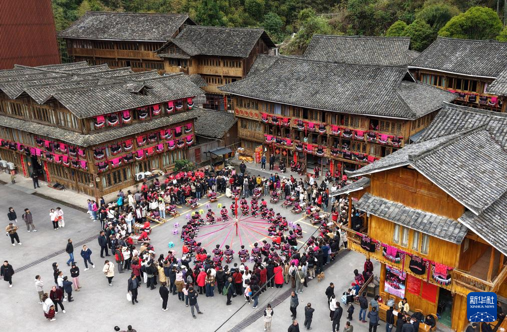 3月31日,当地群众在广西三江侗族自治县古宜镇表演民族歌舞(无人机照片)。