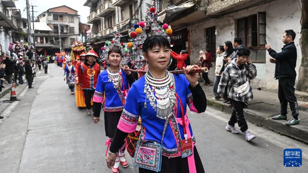 3月31日,在广西三江侗族自治县古宜镇举行的“三月三”庆祝活动上,侗族群众沿街表演。
