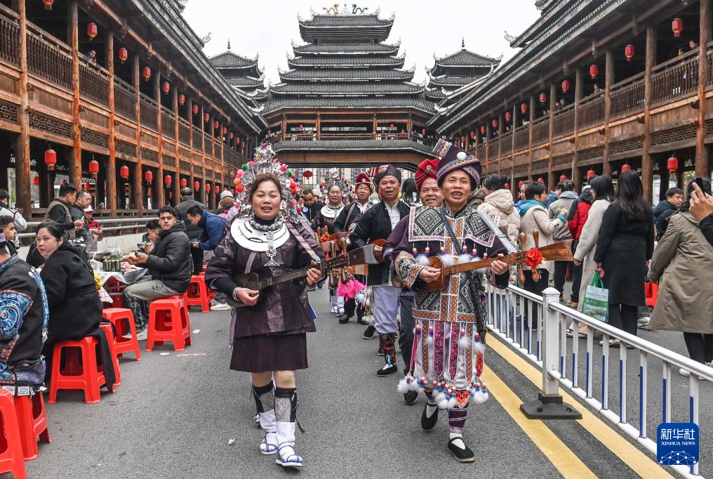 3月31日,在广西三江侗族自治县古宜镇举行的“三月三”庆祝活动上,侗族群众吹奏芦笙。