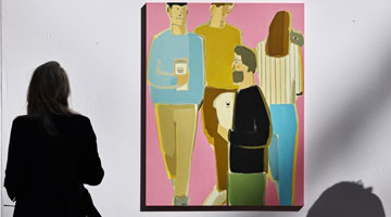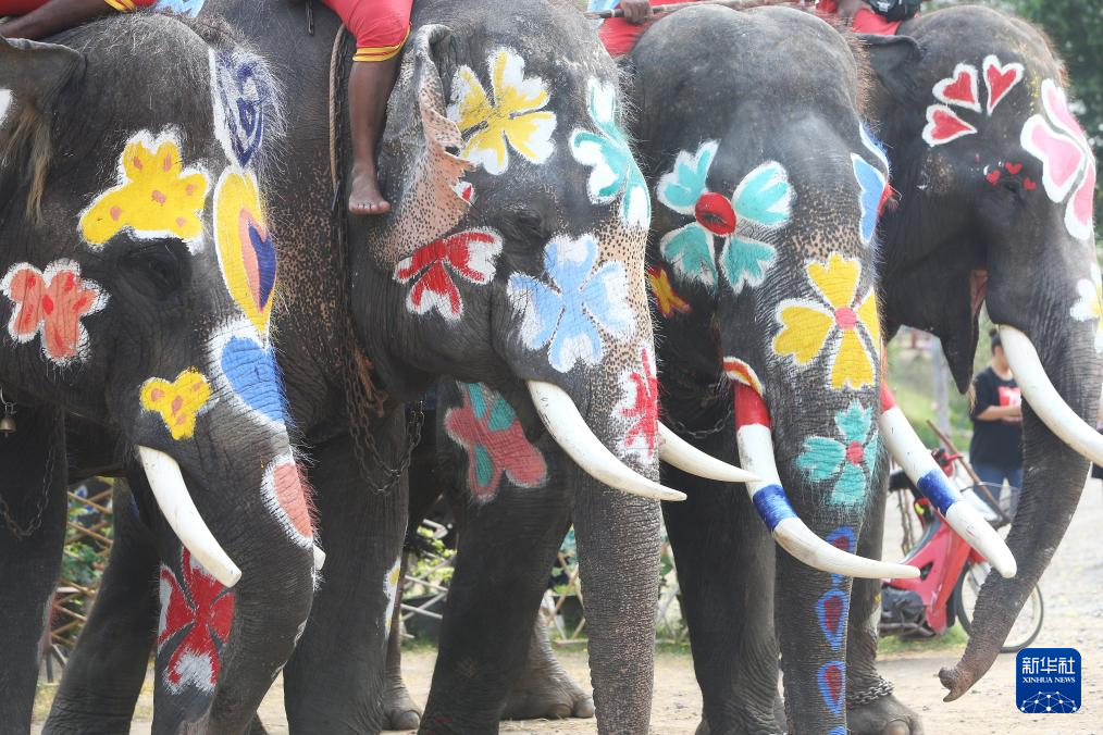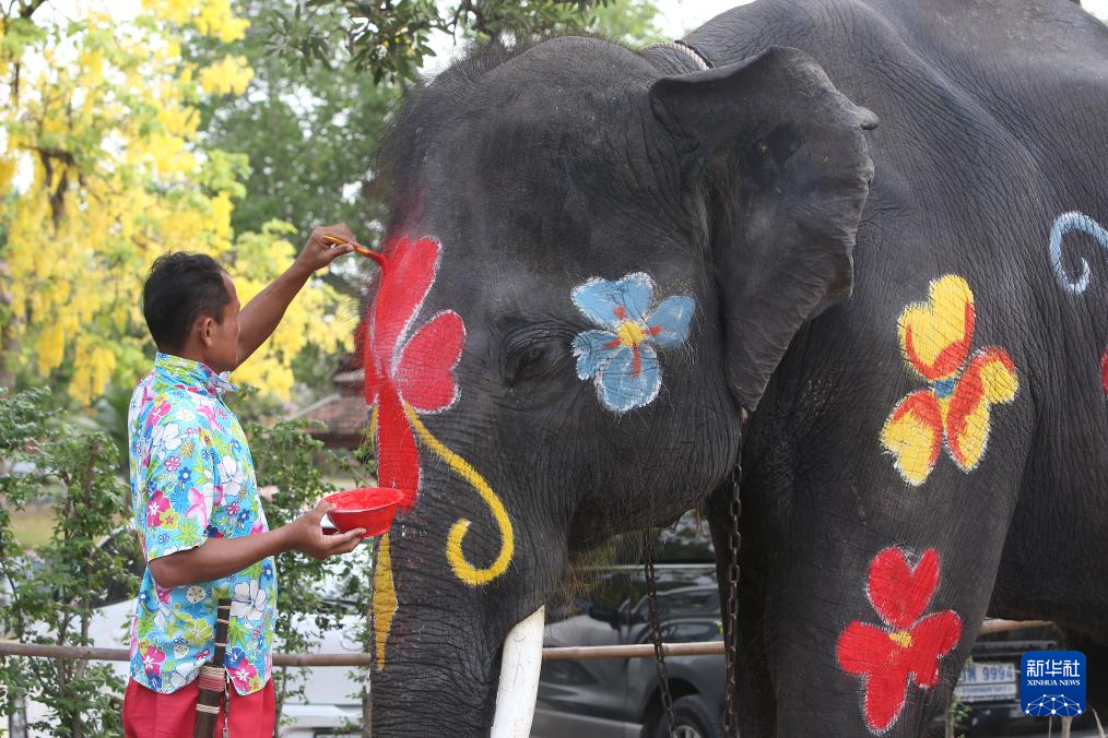 4月10日,在泰国大城府,一名男子为大象进行彩绘。