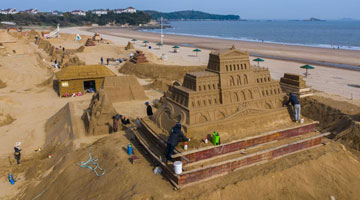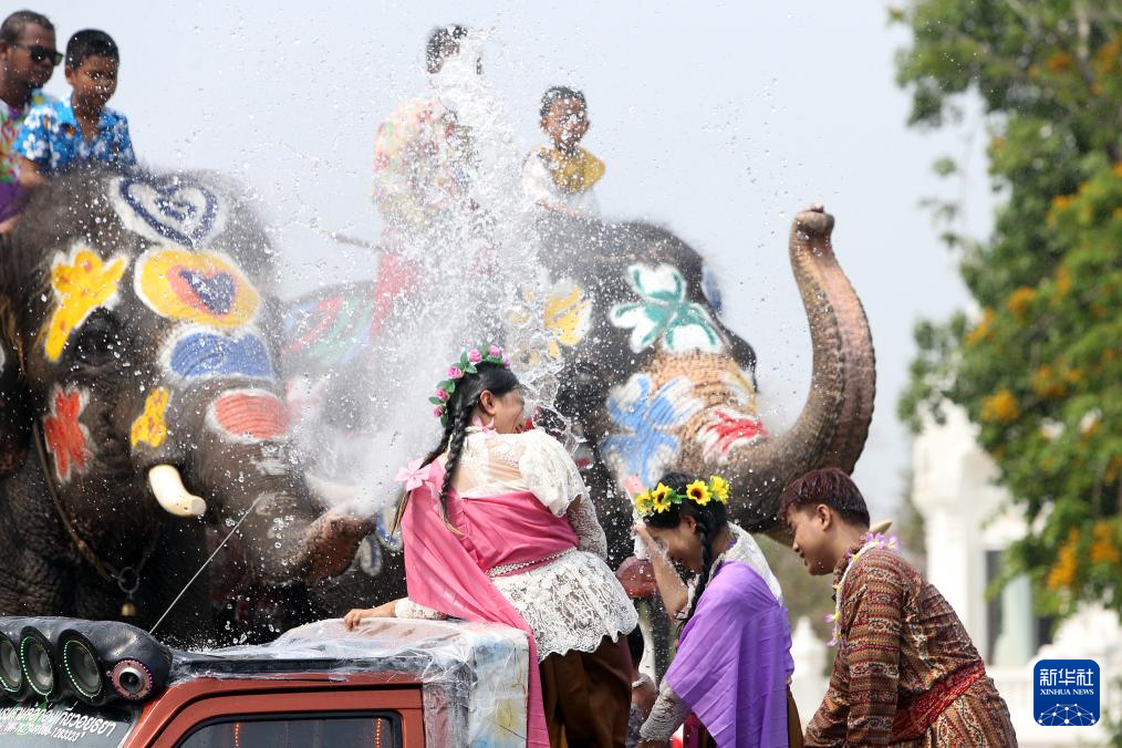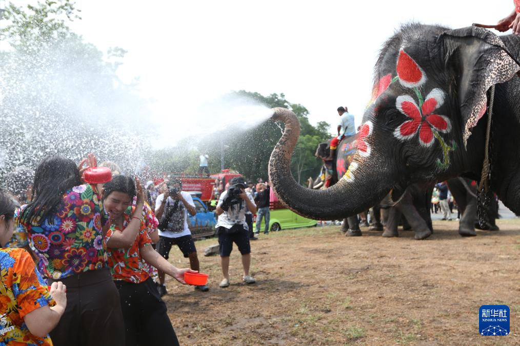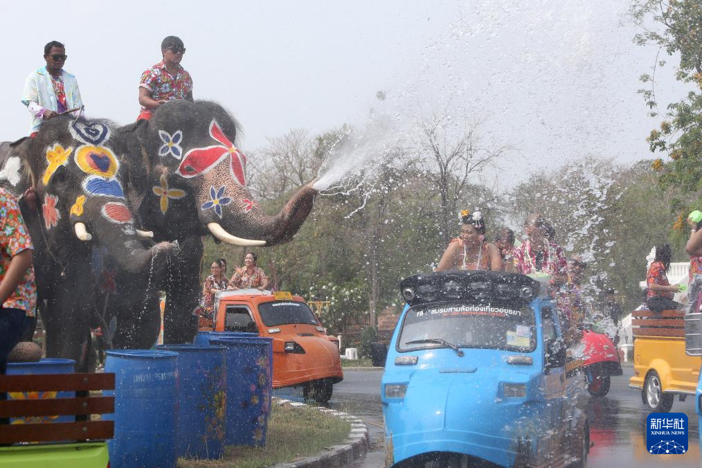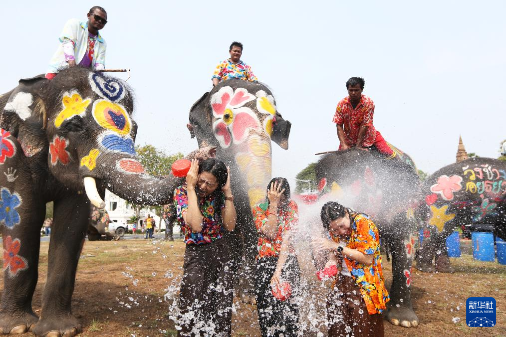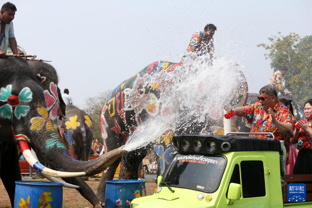 当天,人们在泰国大城府和大象相互泼水,迎接即将到来的宋干节。每年4月13日至15日是泰国传统新年宋干节,也称泼水节,人们以互相泼水的方式表达迎新祝福。