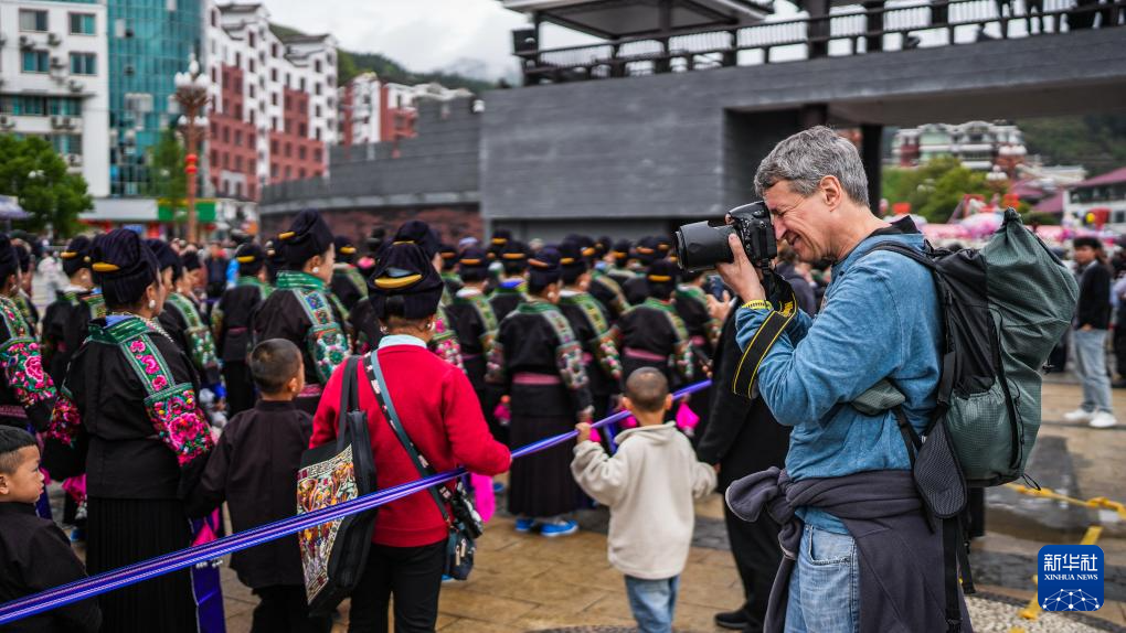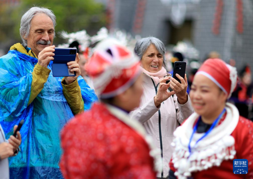 4月12日,外国游客在庆祝活动上拍摄当地少数民族群众。