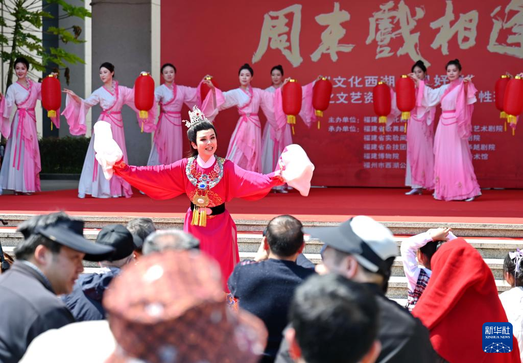 4月6日,福州闽剧艺术传承发展中心演员与游客在福州上下杭历史文化街区开展浸入式互动演出。