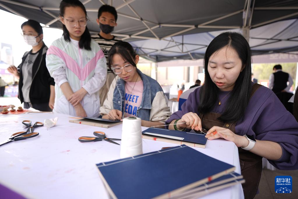 4月20日,市民在活动现场体验古籍装帧。