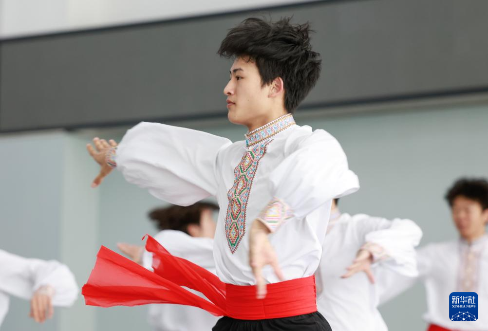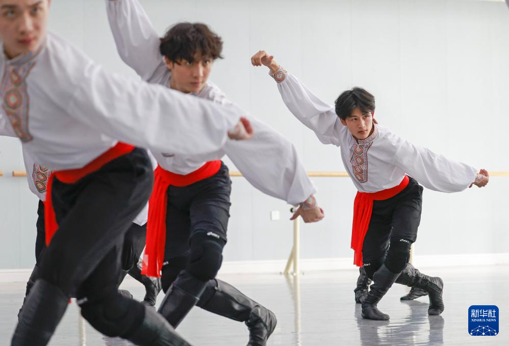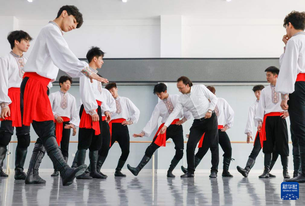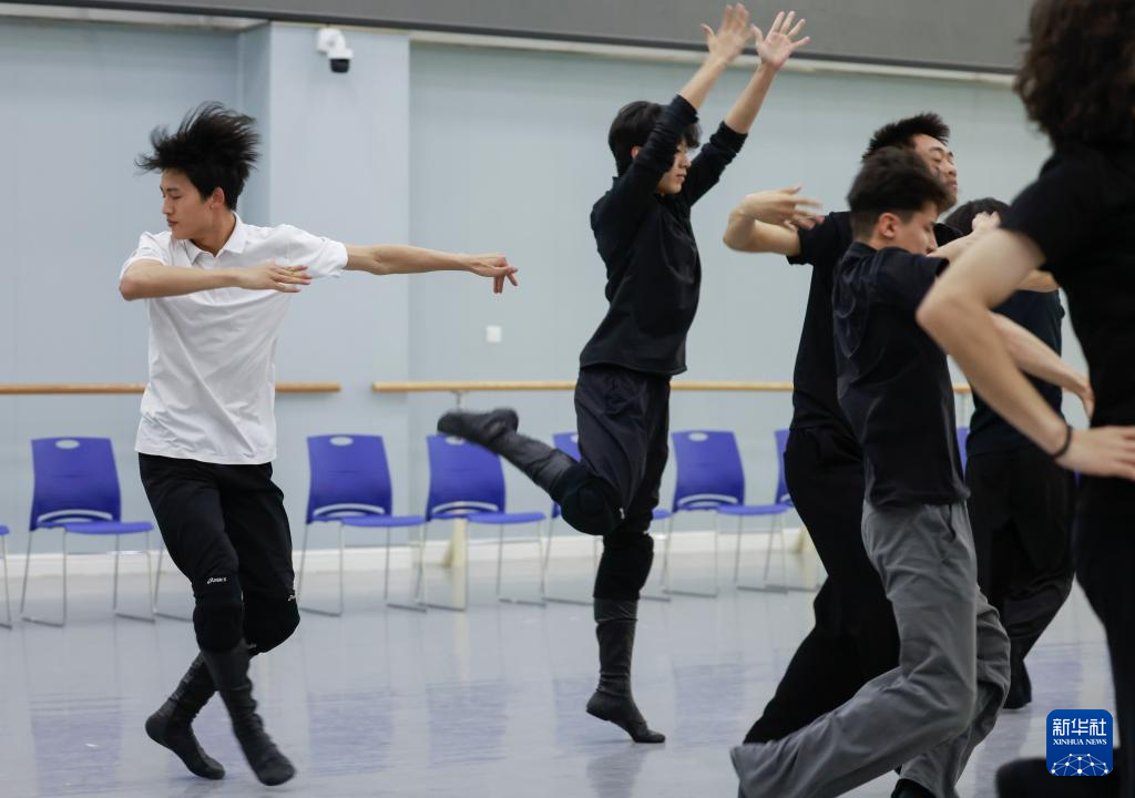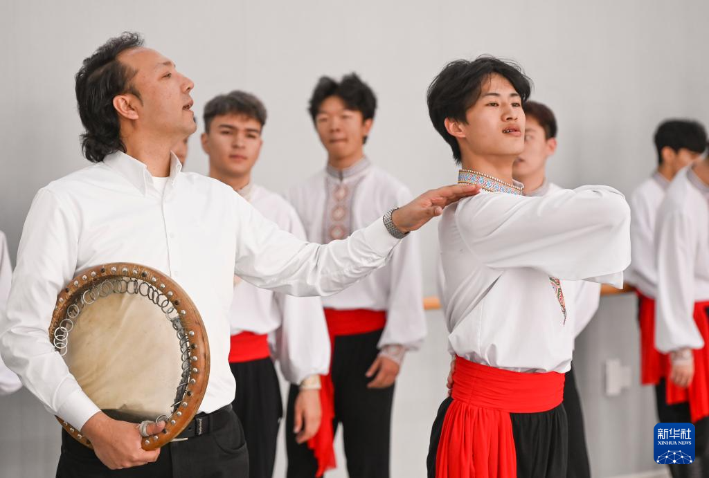 4月14日,罗昊(左)和同学在舞蹈学院专业技能课教室里排练群舞《阳光下的麦盖提》。