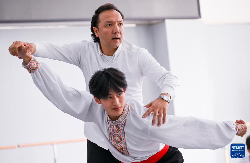 4月14日,罗昊(前)在舞蹈学院教师买买提·马木提的指导下学习维吾尔族舞蹈。