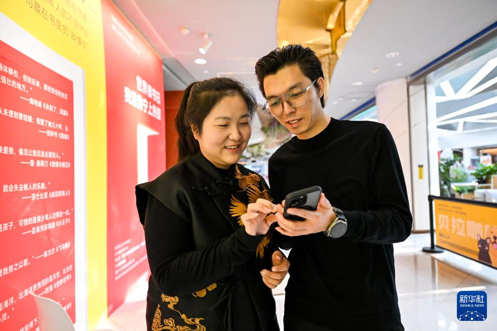 4月21日,在乌兰察布市集宁区言知书店,巩懋林(右)与妻子蒲欣查看拍摄的打卡照片。